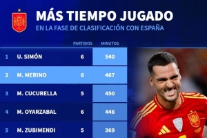 体育资讯11月19日讯 德国转会市场统计了西班牙球员本届世预赛的出场时间,并列出榜单,门将西蒙540分钟居首,梅里诺467分钟非门将球员中最多。