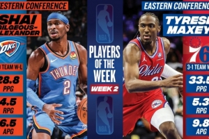 体育资讯11月4日讯 今日NBA官方公布了2025-26赛季第二周东西部最佳球员,马克西和亚历山大分别当选。