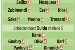体育资讯11月27日讯 拜仁在本轮欧冠客场1-3不敌阿森纳,《图片报》在赛后为两队将帅评分。