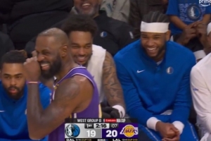 GIF-詹姆斯在场上和替补席的欧文聊天 直接笑尿了