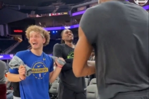 赛前,鹈鹕球员卢尼和普尔来到场边,和前队友波杰姆斯基、库明加等人有说有笑。