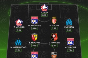 中场:梅森·格林伍德(马赛,7.56分)、弗洛里安·托万(朗斯,9.58分)、瓦伦汀·隆吉耶(雷恩,8.17分)、阿布纳·维尼修斯(里昂,7.74分)