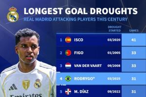 据德转统计,罗德里戈31场球荒场数在本世纪皇马进攻球员上可以排到第4位,仅次于伊斯科、菲戈和范德法特的球荒场数。