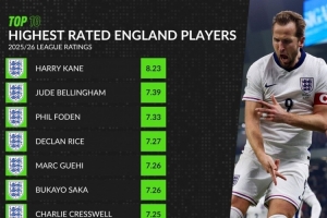 体育资讯12月5日讯 WhoScored统计了本赛季英格兰球员的联赛场均评分,并列出榜单,凯恩居首,贝林厄姆、福登分列二三位。