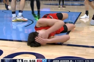 "倒地不起之后,裁判并没有吹停比赛。根据规则,在这种情况下比赛通常不会被叫停。我记得卡梅隆·安东尼曾经也有过类似的情况,他在一次比赛中脸部被击中后倒地,几乎整整一分钟的比赛时间内都躺在地上,期间双方进行了多次攻防转换。这时除非教练叫暂停,否则比赛一般不会因此中断。有时候裁判会吹停比赛,但如果球员没有妨碍到比赛进行,他们通常不会这么做。像这样的情况,比赛还是会继续进行,直到出现自然的停顿或者有人叫暂停。如果没有的话,裁判也没有义务必须吹停比赛。我并没有觉得裁判在操控比赛。”