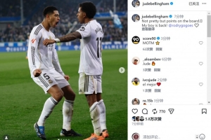 皇马中场贝林厄姆更新社媒动态,晒出与连场进球的罗德里戈的合照,配文:“赢得不漂亮,但三分到手。我的兄弟回来了!”