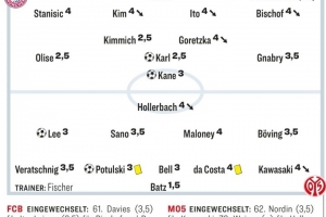 体育资讯12月15日讯 德甲第14轮比赛,拜仁主场2-2战平美因茨,德国媒体《踢球者》对两队球员进行了评分,奥利塞、基米希、卡尔2.5分拜仁队内最高。