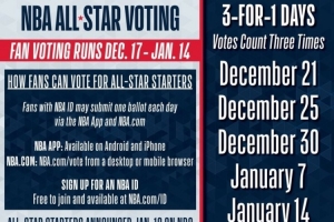三倍投票日为:12月22日、12月26日、12月31日、1月8日、1月15日,全明星首发名单将于1月20日在NBC公布!
