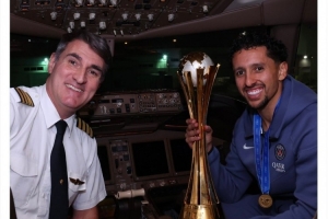 巴黎圣日耳曼球员们带着奖杯乘坐飞机返回巴黎,俱乐部官方社媒晒出队长马尔基尼奥斯手拿奖杯与机长的合照,配文:“前往巴黎!”
