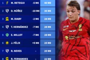 体育资讯12月18日讯 今日德转更新了沙特联球员身价,雷特吉下跌500万至4000万欧仍是沙特联第1,努涅斯暴跌1000万,菲利克斯逆势上涨至2500万欧。