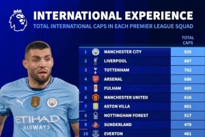 英超各队球员为国家队出战场次排名: