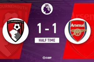 上半场伤停补时2分钟,半场结束,阿森纳暂1-1伯恩茅斯。