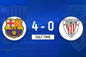 巴萨4球领先!拉菲尼亚和巴德吉均献传射!第38分钟,巴德吉精准长传转移,拉菲尼亚小角度爆射上角得分,巴塞罗那4-0毕尔巴鄂!↓