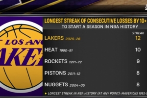 备注:在赛季任何时段,连续输两位数纪录是1992-93赛季的小牛(21场)