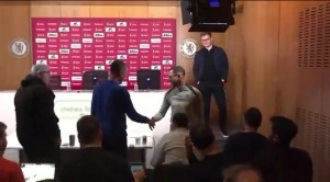 41岁的切尔西新帅罗塞尼尔首场赛前发布会,与场下的记者一一握手