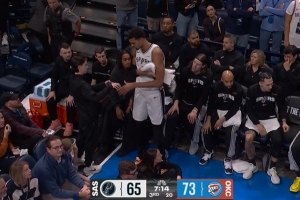 危险动作!文班跳起抢板 亚历山大倒地夹住其脚导致摔倒!