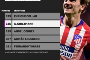 据Opta数据统计,格里兹曼已追平安赫尔·科雷亚,335次出场并列成为马德里竞技历史上出场次数第二多的前锋,目前仅次于恩里克·科拉尔的339场。