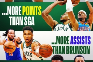 美媒Clutchpoints列出了有趣的对比,比得分字母哥场均得分高于亚历山大的33分,比助攻多过布伦森的6.1次,比三分命中率他比库里的38.9%要高(字母哥场均出手为1.6次)。