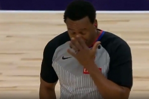 GIF-桑托斯传球被兰德尔干扰,球砸到裁判再到穆迪手里进三分